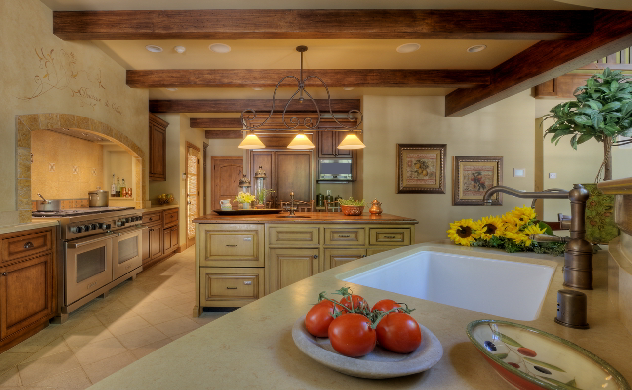 For these wine connoisseur homeowners, this custom built new home pairs rustic furnishings (such as the hand-finished cabinetry, iron light fixtures, and Italian oil-rubbed bronze plumbing fittings) with a rich palette of earthy colors in an effort to replicate the historic charm of a Napa Valley country estate.